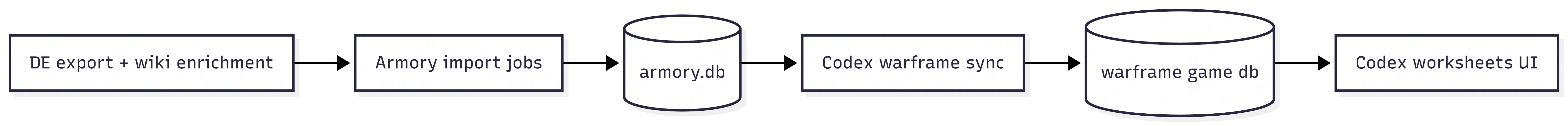 Warframe support is not a second independent encyclopedia. Codex reads Armory’s SQLite database (ARMORY_DB_PATH) to understand which names exist in which worksheet buckets - warframes, primaries, companions, modular weapons, and so on. Sync code compares that ground truth to what is already stored in Codex’s own Warframe tables and updates rows accordingly.